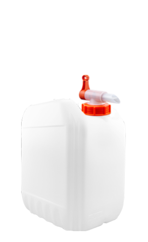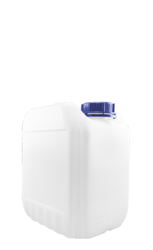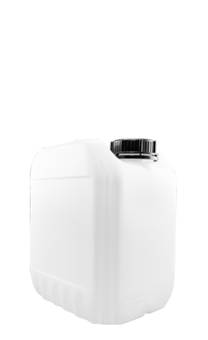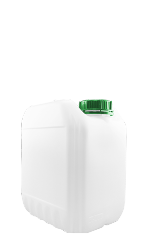 Envase elaborado con resina de PEAD. Su diseño es estibable con soportes antidesplazamiento y asa para un fácil manejo.